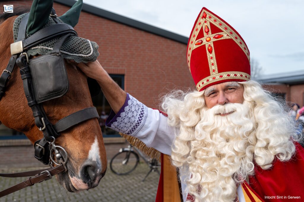 Sinterklaas in Gerwen: een en al vrolijkheid en gezelligheid! Sinterklaas en zijn paard Cupido staan klaar voor vertrek naar Gerwen. Groepsfoto van Sinterklaas en al zijn Pieten. Eerst begroet en inspecteert Sinterklaas de drumfanfare "Jong Leven" uit Gerwen. De...