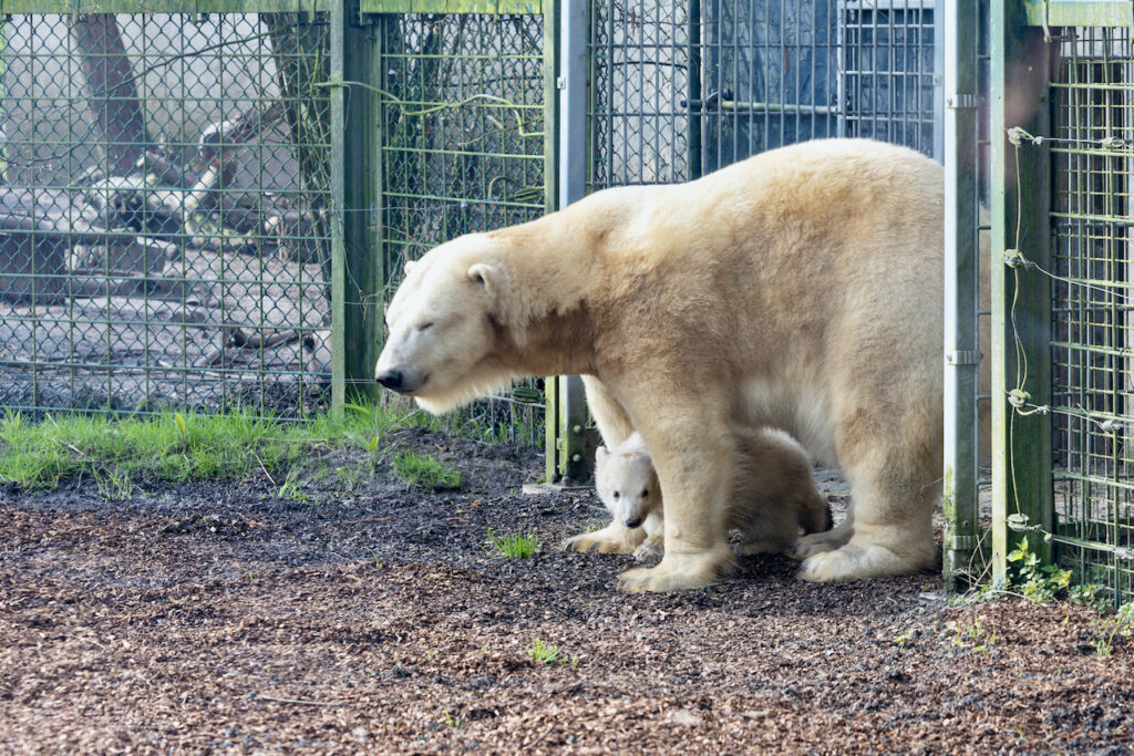 IJsbeer Otis zet de eerste stappen buiten de kraamkamer.