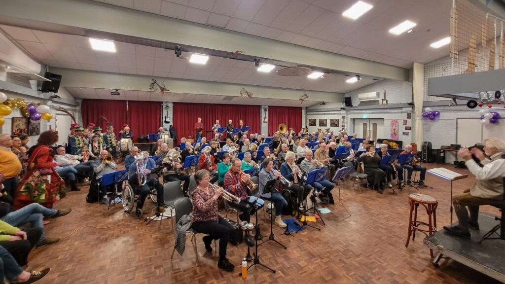Repetitie van orkest Carnavalesk voor de Carnaval2024 in de zaal het Trefpunt Belgiëplein, "Woensel" in het bijzijn van Prins Nexus en zijn gevolg van de Dwersklippels. Foto's en tekst: Frans van...