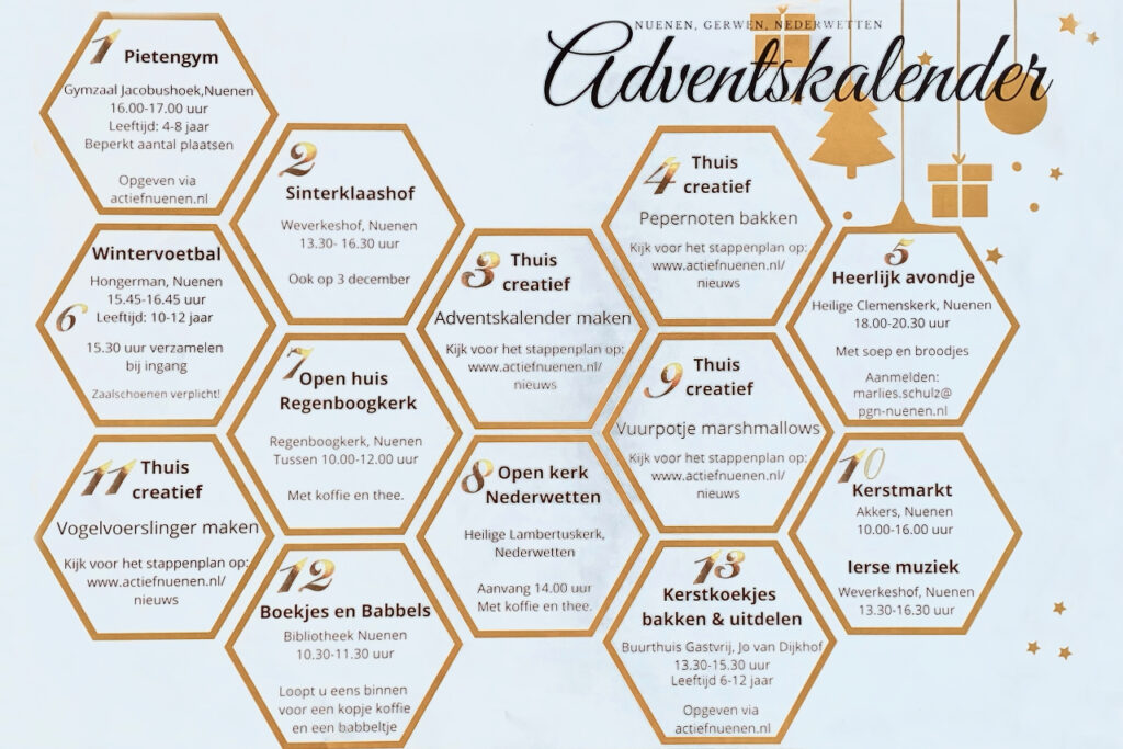 Levende adventskalender van Nuenenaren voor Nuenenaren Ook dit jaar is er in december veel te beleven in Nuenen! De adventskalender is eind november breed verspreid. Mocht je hem niet ontvangen hebben, of niet meer kunnen vinden: hier is hij digitaal. Zien we...