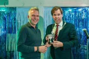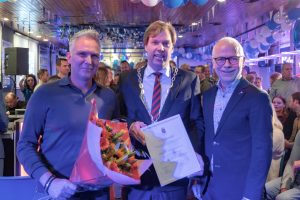 Een statiefoto hoort bij zo’n uitreiking: (v.l.n.r.) Gert-Jan Bloemen, voorzitter RKVV, Freek van Genugten, burgemeester van de Gemeente Nuenen, Gerwen en Nederwetten en Sandor Löwik, wethouder Gemeente Nuenen c.a.