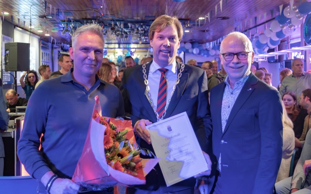 Een statiefoto hoort bij zo’n uitreiking: (v.l.n.r.) Gert-Jan Bloemen, voorzitter RKVV, Freek van Genugten, burgemeester van de Gemeente Nuenen, Gerwen en Nederwetten en Sandor Löwik, wethouder Gemeente Nuenen c.a.