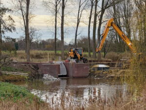 Begin December krijgt de nieuwe stuw bij de watermolen van Opwetten serieus herkenbare vormen.