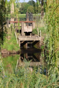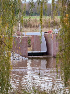 Het metselwerk met de klep van de stuw. Rechts de ronde vorm van de ‘wokkel’, die het straks mogelijk maakt, dat vissen deze stuw, net als de stuwen bij de Hooijdonkse EN Collse watermolen, gemakkelijk(er) kunnen passeren.
