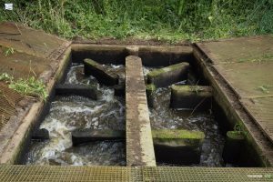 Bij de Collse watermolen ligt een betonnenbak (normaal met roosters erop) waarin schotten staan in een Zig-zag patroon.